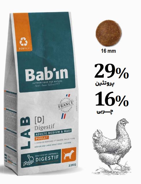 غذای خشک مخصوص سگهای بالغ و جونیور و با سیستم گوارش حساس، از برند معتبر و نام آشنای بابین با کیفیت فوق العاده اش تهیه شده است . این محصول یک غذای خشک درمانی (BABIN LAB) با طعم گوشت مرغ و دارای 26 درصد پروتئین و تنها 9 درصد چربی است و با ال کارنیتین غنی شده است . ال کارنیتین سبب بالا بردن متابولیسم در بدن حیوان می شود، لذا غذا با سرعت و راحت تر هضم شده و به سیستم گوارش حیوان فشار نیامده و سگها بعد از خوردن این برند و این مدل غذا دچار ناراحتی های معده نخواهند شد.